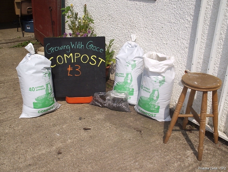 Kompost sa predáva v cene 3 libry za 40-litrové vrece kompostu (vrece váži cca 25kg).