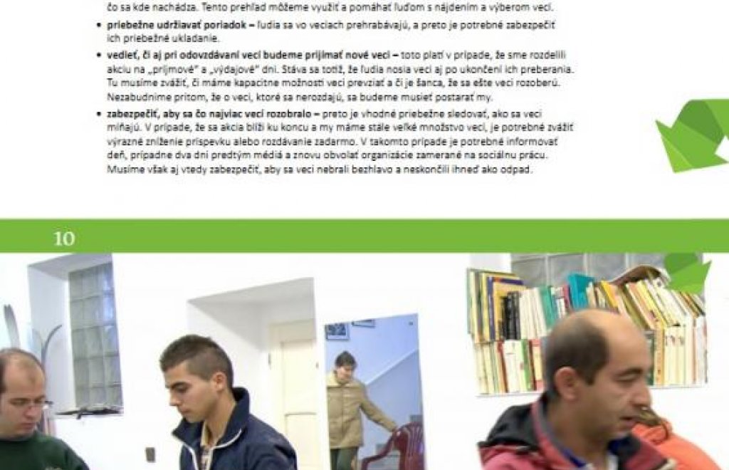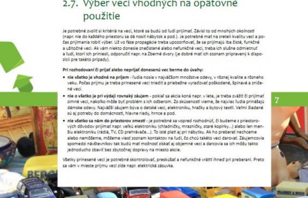 Manuál popisuje ako vo vašom meste/obci zorganizovať výmennú ekologicko-charitatívnu burzu a ako tak môžete mnohým veciam nájsť nové využitie, predĺžiť tak ich životnosť a znížiť množstvo odpadu. Manuál je doplnený fotografiami a obsahuje tiež mnoho praktických rád, na čo všetko by ste mali myslieť pre úspešné zvládnutie organizácie akcie.