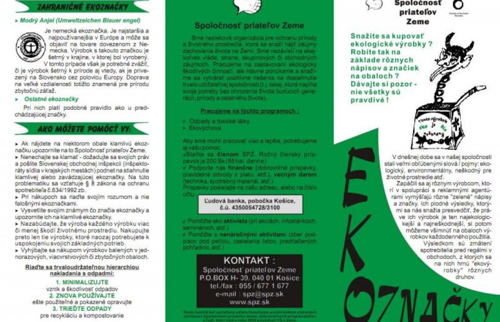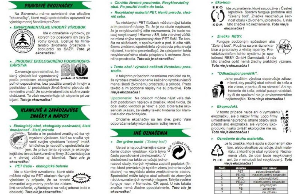 V letáku sa dozviete, čo sú to ekoznačky a aké druhy ekoznačiek sa používajú. Tiež sa dozviete ako odlíšiť pravdivú ekoznačku od klamlivých a zavádzajúcich nápisov a značiek a ako môžete pomôcť vy.