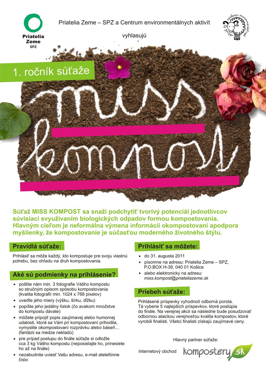 Nezvyčajnú príležitosť pre záujemcov o domáce kompostovanie ponúkajú Priatelia Zeme – SPZ a Centrum environmentálnych aktivít, ktorí dnes vyhlasujú prvý ročník celoslovenskej súťaže Miss Kompost. Jej zmyslom je zvýšiť povedomie o kompostovaní ako súčasti moderného životného štýlu a tvorivosť ľudí pri využívaní biologického odpadu.